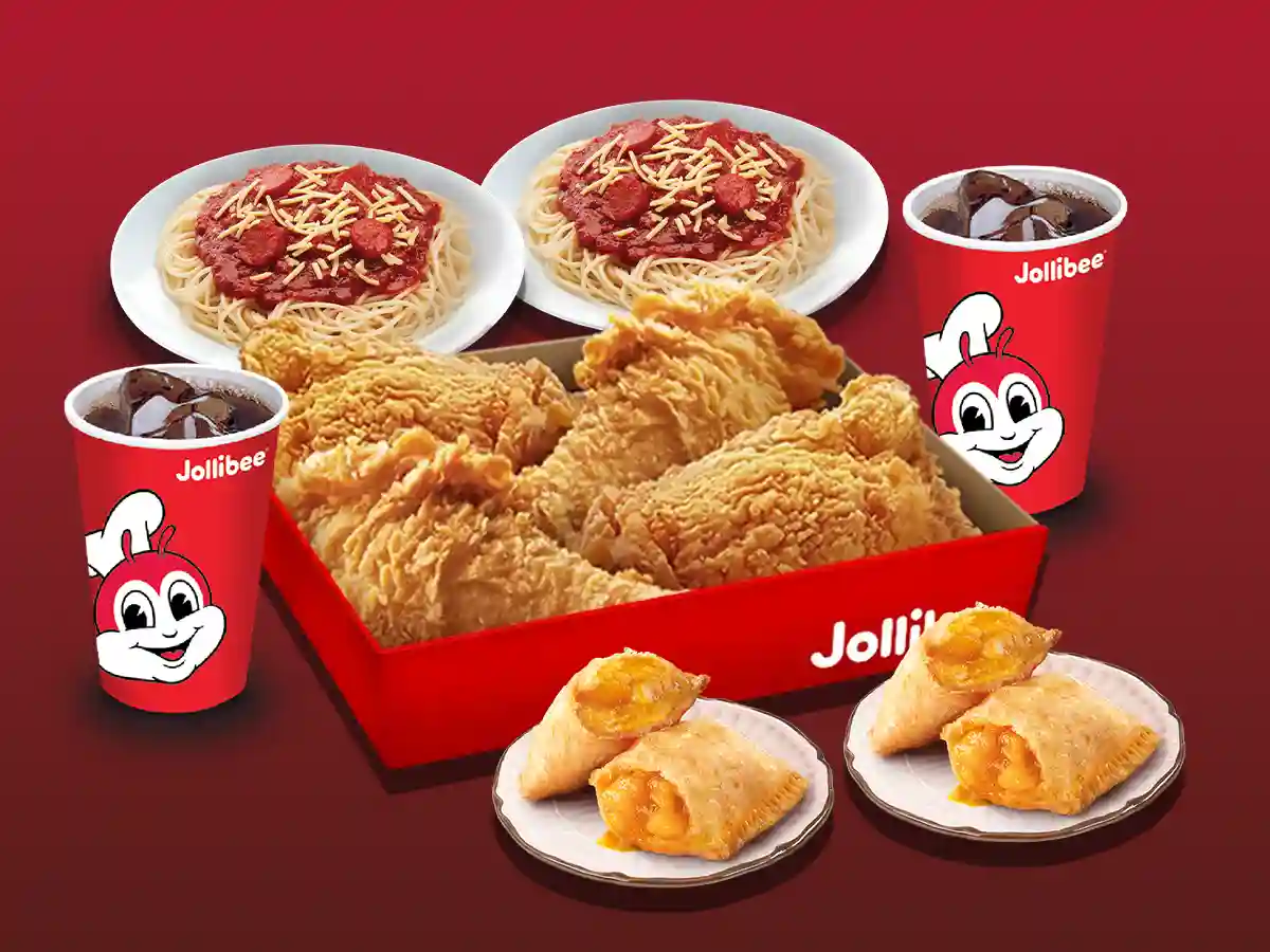 2Pcs original Chickenjoy, 2Pcs spicy Chickenjoy, 2 Half Jolly Spaghetti, 2 Peach Mango Pie, 2 Pepsi(Large)