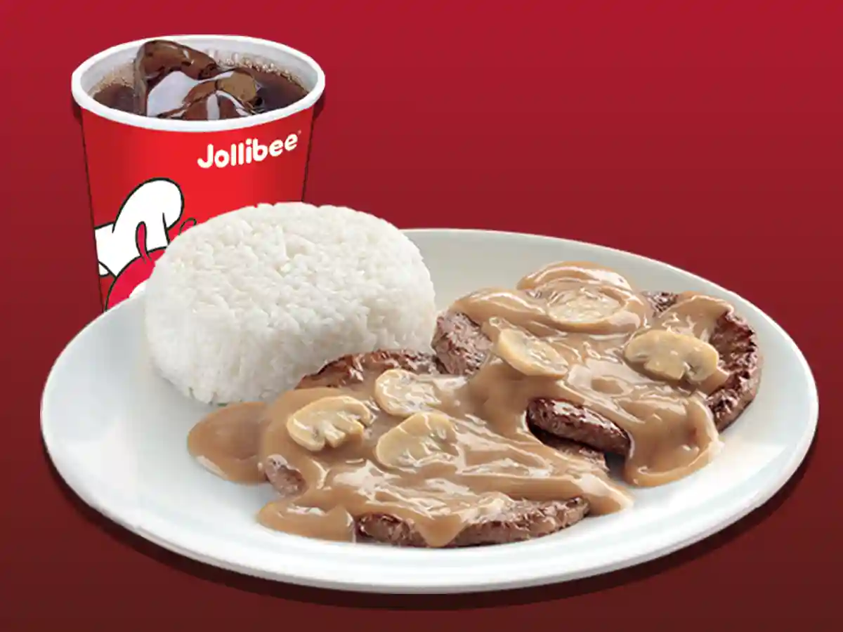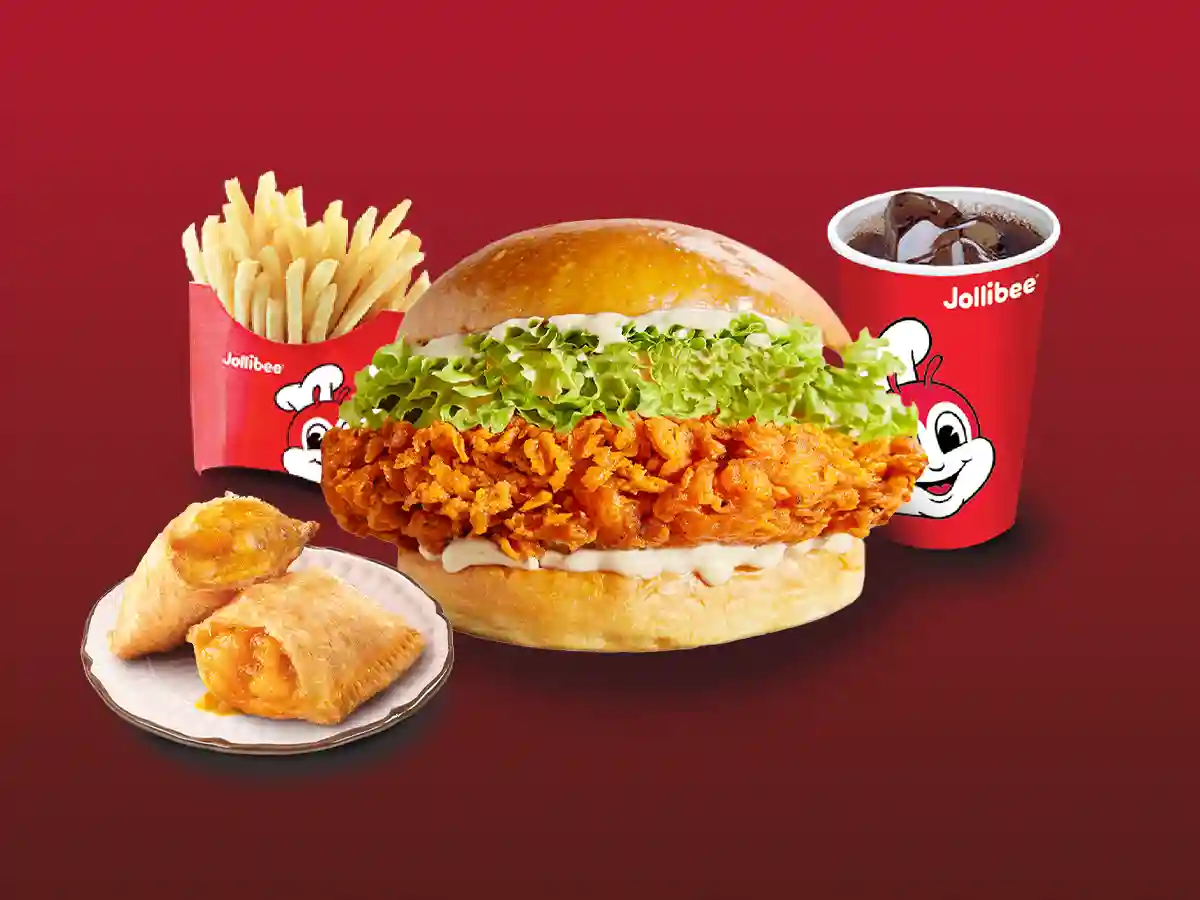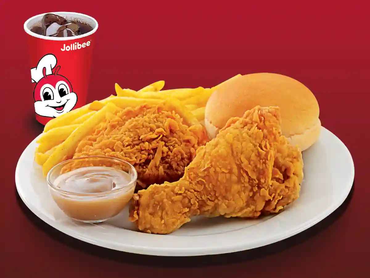 1pc Spicy Chickenjoy with (half) Jolly Spaghetti, 1pc Burger Steak with rice, Peach Mango Pie and Pepsi(Large)