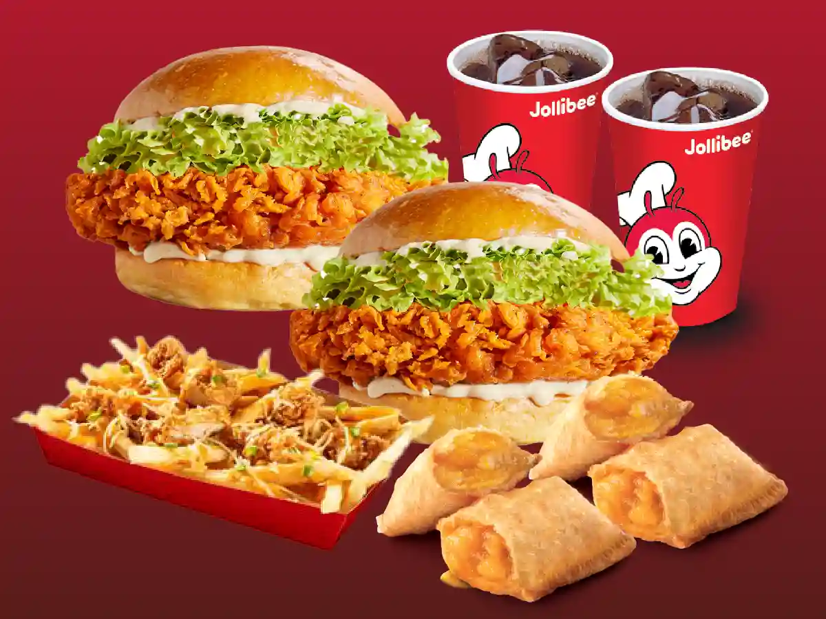2Pcs Burgersteak w Rice, 2Pcs Spicy Chickenjoy, 2 Peach Mango Pie, 1 Large Fries, 2 Pepsi(Large)