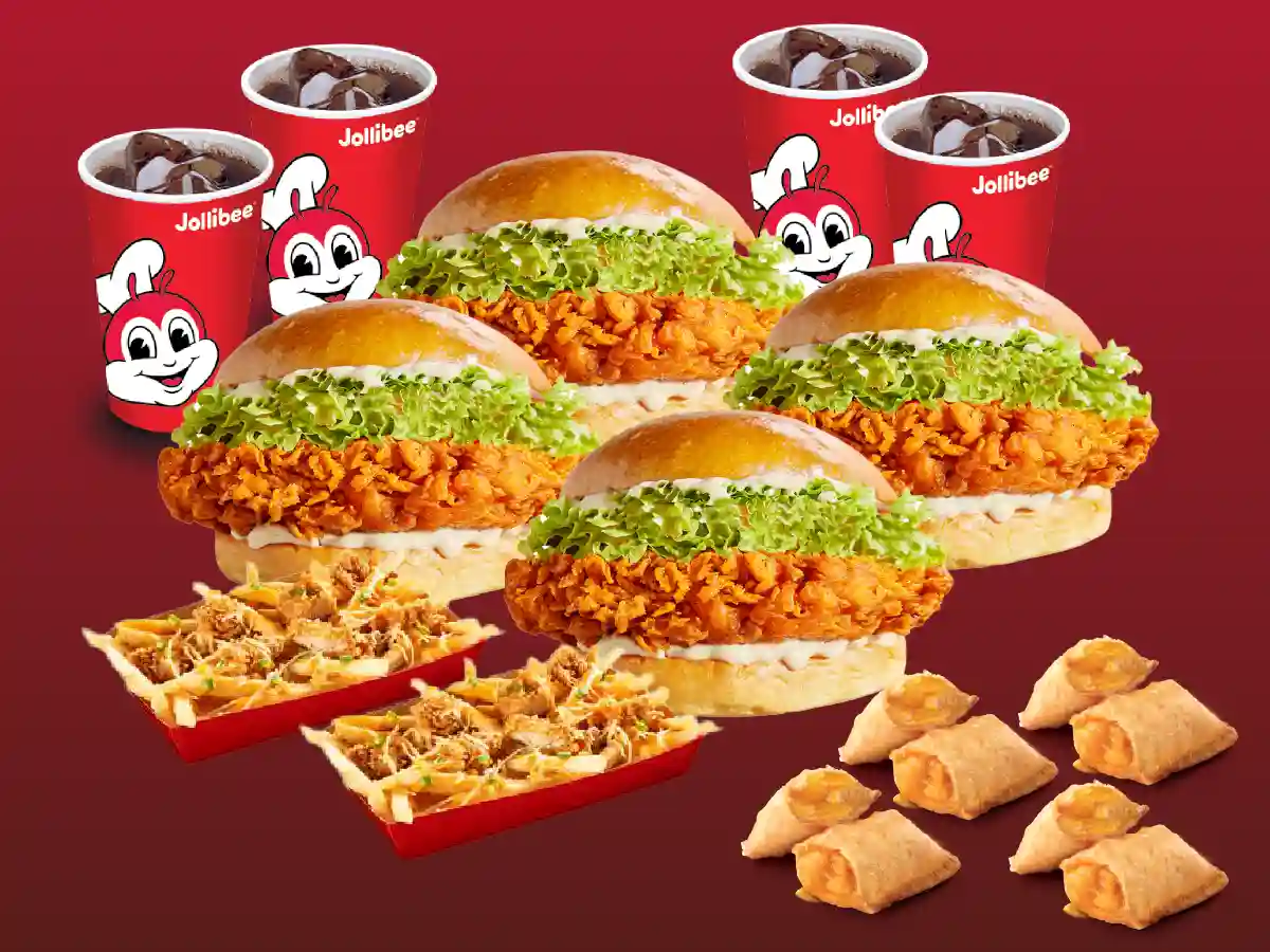 5Pcs Spicy Chickenjoy, 4Pcs Original Chickenjoy, 2 Burger Steak & Rice, 2 Jolly Spaghetti, 2 Cheesy Yumburger, 4 Pech Mango pie, 4 Pepsi Bottle(1L)