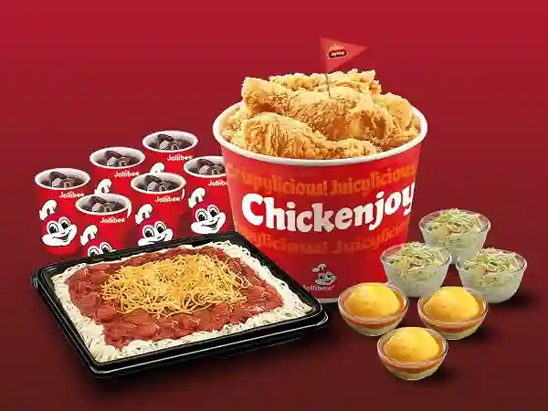 6Pcs Spicy Chickenjoy, 6Pcs Original Chickenjoy, 1 Family Pan Jolly Spaghetti, 3 Mashed Potato, 3 Coleslaw, 2 Pepsi Bottle(1L)
