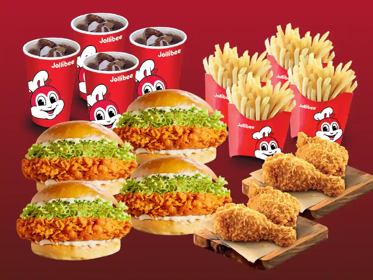 5Pcs Spicy Chickenjoy, 4Pcs Original Chickenjoy, 2 Burger Steak & Rice, 2 Jolly Spaghetti, 2 Cheesy Yumburger, 4 Pech Mango pie, 4 Pepsi Bottle(1L)